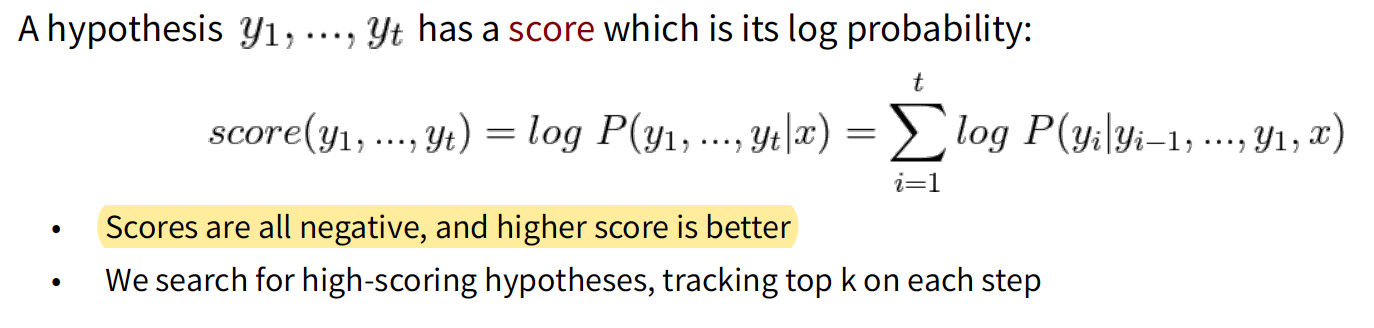 On each step of decoder, keep track of the \(k\) most probable partial translations (which we call hypotheses), where \(k\) is the beam size (in practice around 5 to 10). Although it’s not guaranteed to find optimal solution, it’s still much more efficient than exhaustive search.