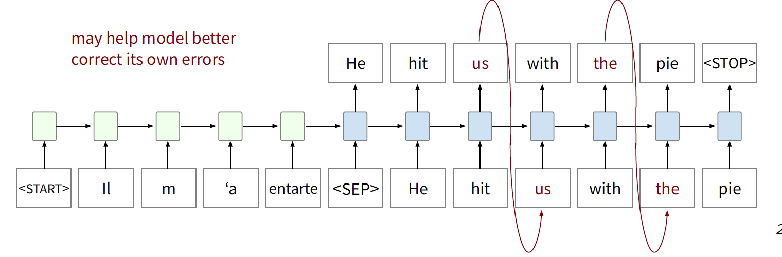 Teacher forcing means that loss is computed at each time step for “gold” input. During training, teacher forcing can be randomly deactivated for a percentage of decoder steps in which predictions instead of gold input are used.