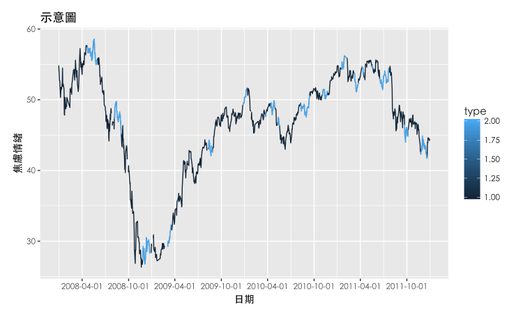 - Build the core model, that is, when the proportion of negative numbers in the first principal component increases for 5 consecutive days, we confirm anxiety. Mark anxiety on the historical stock price chart of the Taiwan Index 50.