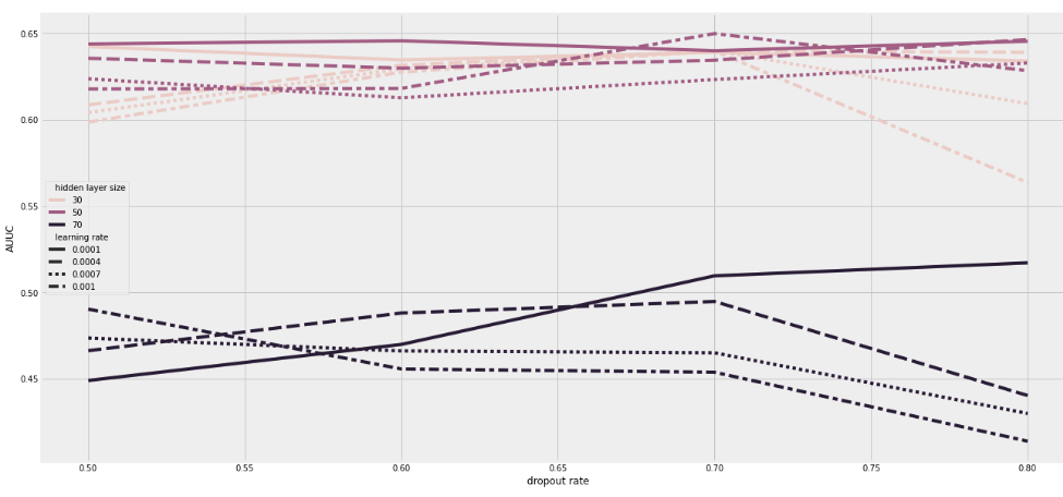 Based on this specific data and parameter setting, when hidden layer size is set to 30 or 50, the AUUC scores are higher than that whose hidden layer size is 70. Expect for this trend, it is difficult to say which learning rate and dropout rate is more suitable. Specific to the pools that we try, the combination of one-layer with 50 hidden layer size, 0.001 learning rate and 0.7 dropout rate is satisfying. This parameter setting has slightly lower AUUC than what we choose to implement Causal net above, therefore, this session is only to show how the tuning could be accomplished.
